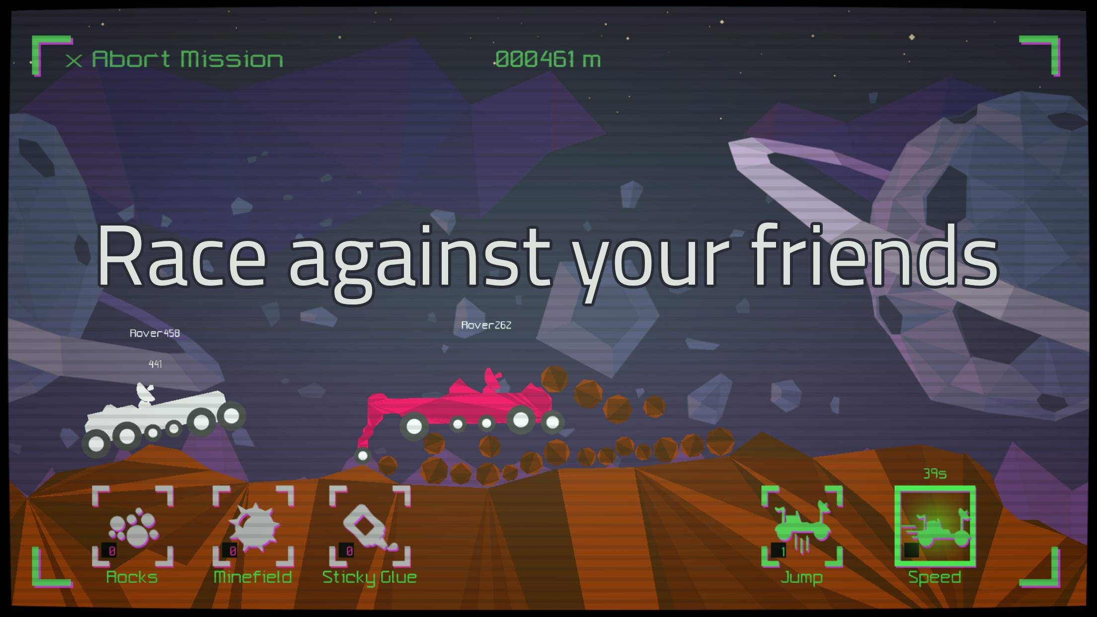 El único límite es su imaginación: alejarse de lo convencional y hacer que su rover sea tan extraño y de forma extraña como desee. Simplemente dibuje el contorno de su vehículo espacial con su dedo, suje hasta 6 ruedas (que se pueden cambiar el tamaño) y luego tome su oficio para un paseo en prueba. ¿Necesitas un poco de ayuda? Pruebe uno de los enchufes para pasar el paso hacia arriba o obtener un impulso de velocidad hacia adelante. ¿No vas por lo que quieras? ¡Comience desde cero y pruebe un nuevo diseño!
